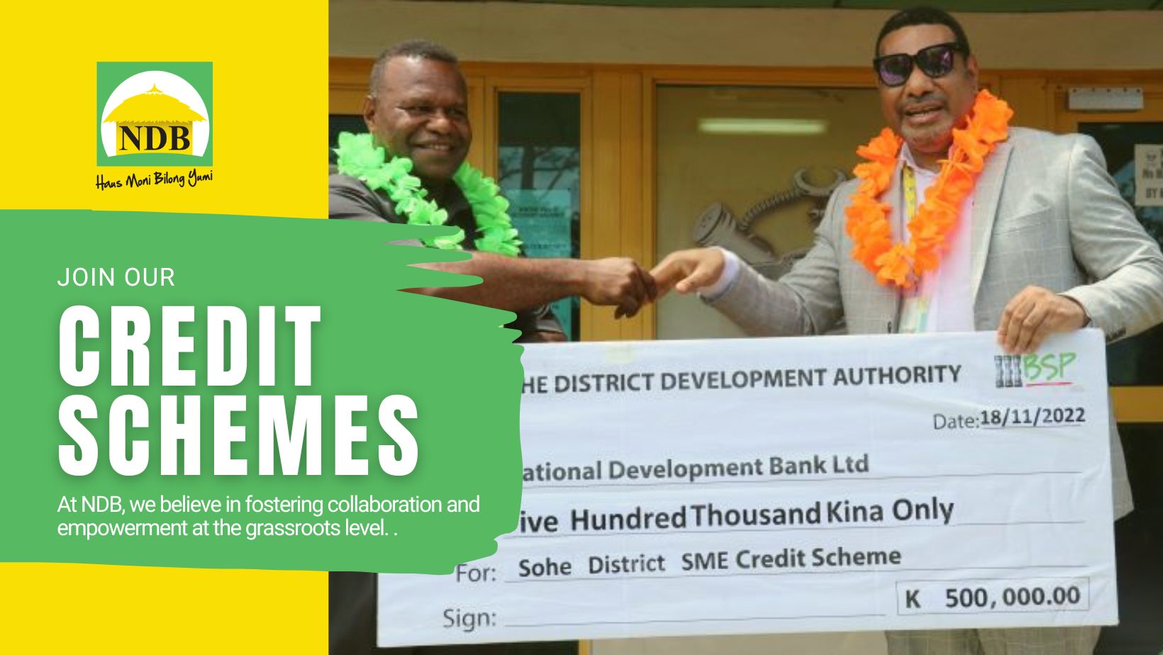 Credit Schemes are loan facilities that are established under agreement between respective parties. In NDB's case, the Bank enters into an agreement with other Government Agencies, Provincial Governments and District Development Authorities (DDA), which are chaired by the local Member of Parliament.